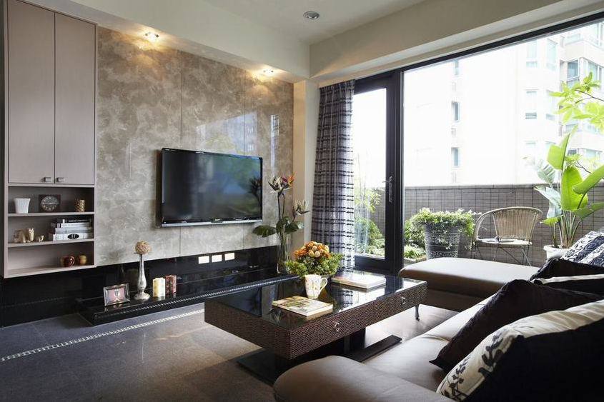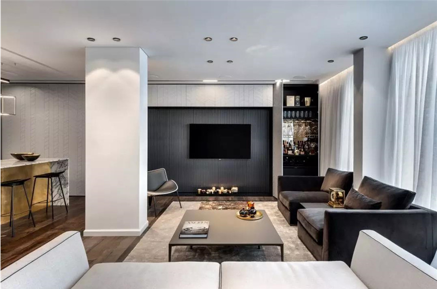 户外露台,石路蜿蜒于草坪间,像通往宁静世界的小径。居者可漫步石路,呼吸清新空气,感受自然美好。累了坐在露台椅子上,欣赏自然景致,让身心彻底放松。过道一侧墙面嵌入玻璃展示柜,电子气焰壁炉为家添彩,升腾跳跃的火焰,让原本酷感的家有了温暖治愈的气息。设计师将岛台局部与飘窗相连,实现一体化设计。横厅的飘窗,最大化利用其价值是设计师与屋主方案洽谈初期确定的优化重点。这样既发挥了飘窗优势,又提高了空间利用率。