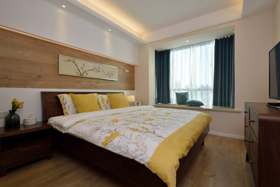 主卧设计简洁耐看。床头背景墙用温润木饰面打造,中间以嵌入式灯带横向分割,立体层次感与温馨氛围扑面而来。主卧背景墙设计带来温馨居住体验。各设计元素相互呼应,构建出个性舒适、酷感温暖的家,让居住者享受生活美好。