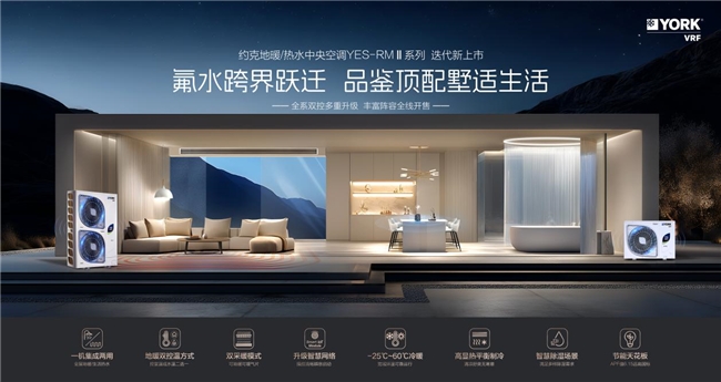 当氟系统的高效与水系统的温润相遇,当科技的精准与生活的细腻共鸣,居家舒适便不再是单一维度的满足,而是跃入全维奢享的新境界。约克VRF承袭百年美式探索精神,重磅推出YES-RM II系列地暖中央空调——以全能智慧探见舒适边界,集空气联动、移动智控、全效地暖、全维净化、富氧新风、静音运行、温湿自控于一体的ALL IN ONE智慧型舒适生活解决全案,为万千家庭带来“风水相融”的舒适革命。