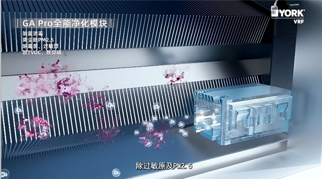 全维健康净化系统采用五重净化方案,全方位守护母婴级健康空气。GA Pro全能净化模块使用约克VRF创新自研NHT-EF双极电离科技,通过双电极脉冲高压电离空气,释放高能电子与空气污染物分子碰撞反应,生成千万级负离子、等离子、强氧化物等活性净化源质,多重机制除菌消毒、除PM2.5、除甲醛及TVOC、除过敏原、除异味等,让家居呼吸更澄澈。VP Pro高效净醛,开机即除醛,无需额外启动“按键或模式”。它凭借中央空调大风量、气流高循环优势,通过双稳固物理吸附与化学分解黑科技,全屋高效除醛,为家人健康筑起一道无醛呼吸防线。在30m³试验舱内1小时甲醛净化率>99.1%,净化效率高于国标F4级累积净醛量,比专业空气净化器更高效除醛,新装修房屋的甲醛污染问题可长效解决。