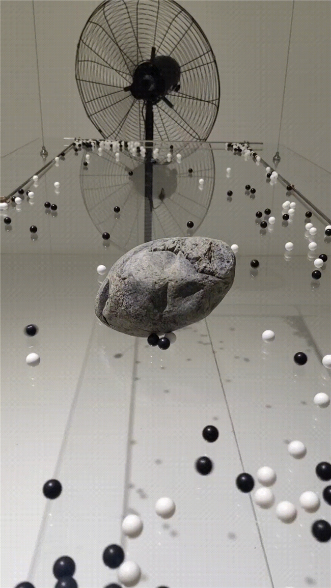在作品《风动》中,张琪凯通过四根钢丝绳固定的长方形玻璃板,上面放置石头以及百余粒白色、黑色玻璃珠,在电风扇的左右摆动中,这些玻璃珠不断地被风吹到高处,又在没有风的时候落到低处。这些珠子滚动起来的感觉很像海浪,而这种“水”的意象恰好与“风”形成了一种微妙的关系,这是否体现出了中国古代哲学中五行相生相克的思想呢?