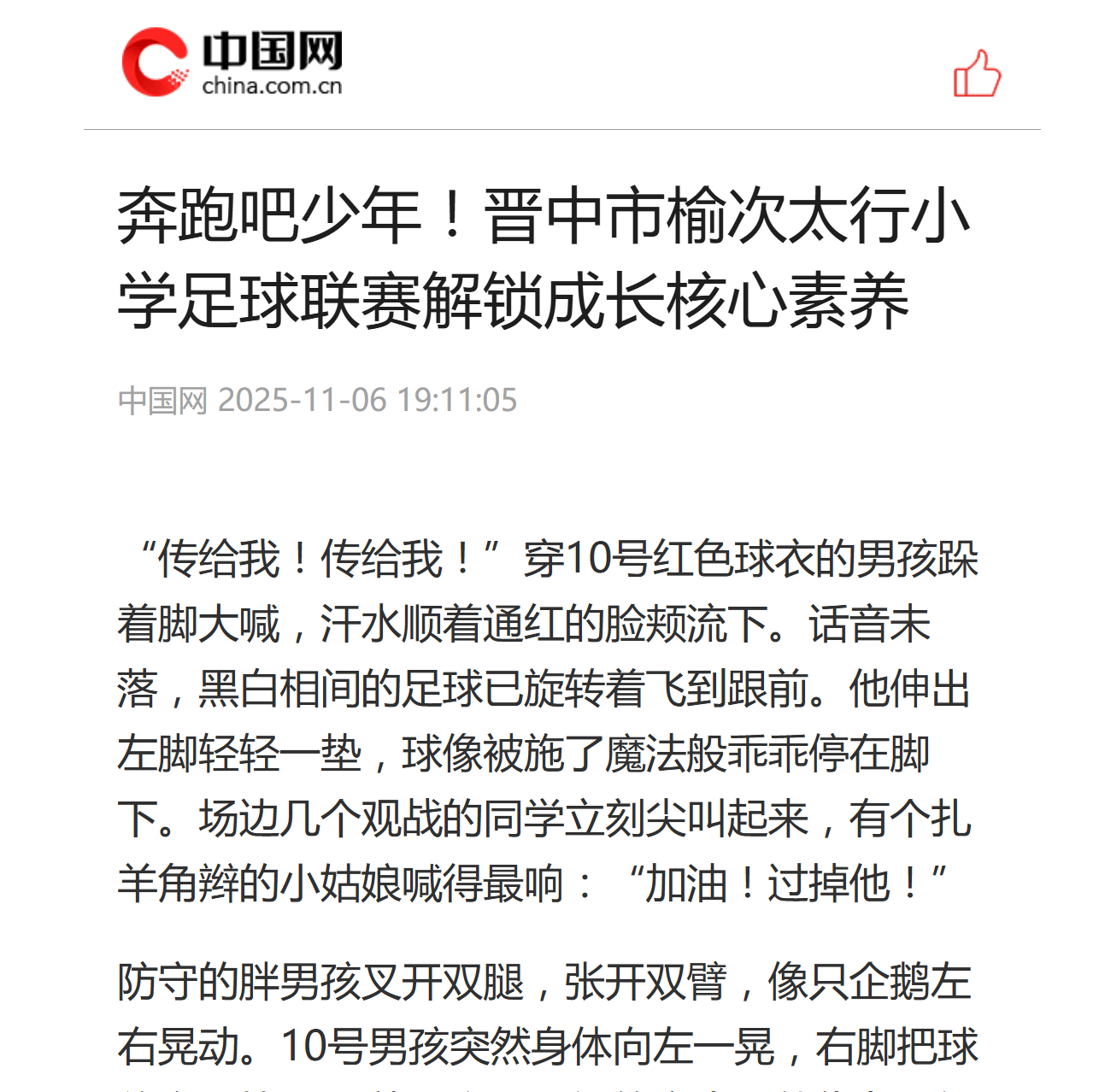 小学生的足球比赛,它是一面镜子,映照出榆次太行小学是否真正践行“立德树人”的根本任务,它是一座桥梁,连接起学校教育与家长社会的期望,它更是一个缩影,展示了“办人民满意教育”能让孩子健康成长、全面发展、终身受益的教育的生动实践。